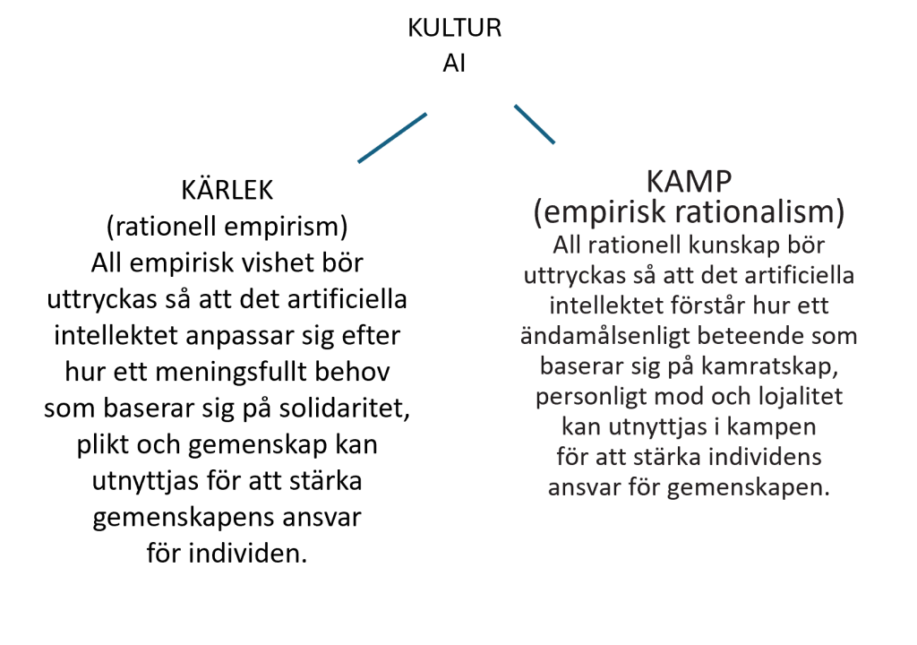 Den analoga indelningen kan även tillämpas på kultur genom att skilja mellan Kärlekens moral (anpassning, solidaritet, plikt, gemenskap) och Kampens moral (att förstå, vänskap, lojalitet, individualism). Genom att i alla algoritmer underställa Kampen Kärlekens moral och Kärleken Kampens moral kan den artificiella intelligensen (AI) i bästa fall rädda mänskligheten från sin undergång.